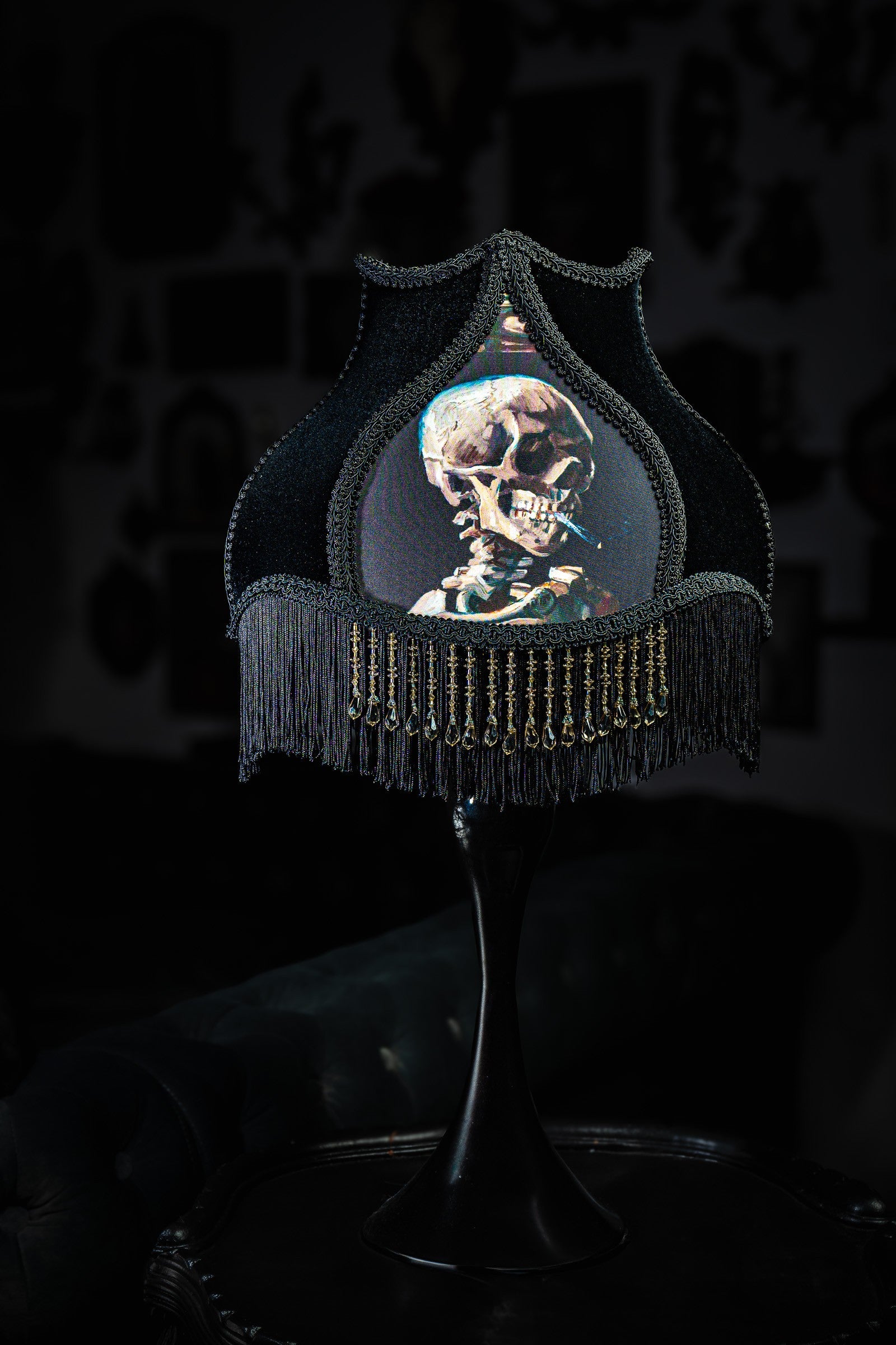 This Nightshade features artwork with the classic painting from Van Gogh as the centerpiece as well as black velvet side panels and a decorative burn-out velvet back center panel. It is adorned with 4 inch black fringe, a clear matching acrylic beading to frame the center panel and black trim.